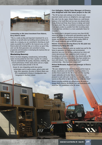 “We were delighted to be selected by Beccy and her team to design, manufacture and install this recycling solution. It is another Kiverco plant for the UK to help meet the recycling targets nationally and locally. Roberts have been a real pleasure to work with and I would like to wish them every success as they strive to take their business to the next level.“