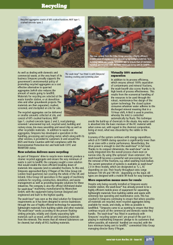 Despite only being recently installed at Simpsons waste transfer station, the wash-bear® has already proved to be a highly efficient mobile piece of equipment for separating lightweight materials from building rubble and waste with extremely low operating and maintenance costs. This has resulted in Simpsons continuing to ensure that where possible all materials are recycled, more recycled aggregates being available for resale, and vitally, as little as possible is landfilled. “Simpsons came to us wanting to ensure that they continue recycle all the commercial and domestic waste they handle. The wash-bear® has fitted in seamlessly with Simpsons’ recycling system and I am proud of the part it is playing in maintaining Simpsons’ pledge to its customers that where possible, all materials’ handled are recycled, with the bare minimum being sent to landfill,” commented Orba Group managing director Barry O’Regan.