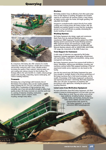 Over the last several years, McCloskey Equipment has gone from strength to strength, thanks to the proven performance of McCloskey machinery that is field tested worldwide, and the wealth of knowledge of McCloskey Equipment’s professional and experienced personnel. Collectively, McCloskey Equipment offers over 100 years of experience of machinery and processing in every application, including the quarry and recycling industries.