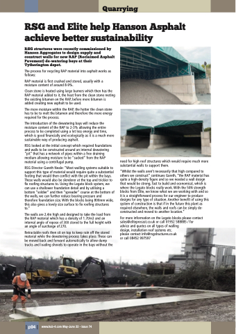 RSG structures were recently commissioned by Hanson Aggregates to design supply and construct walls for new RAP (Reclaimed Asphalt Pavement) de-watering bays at their Tytherington depot.