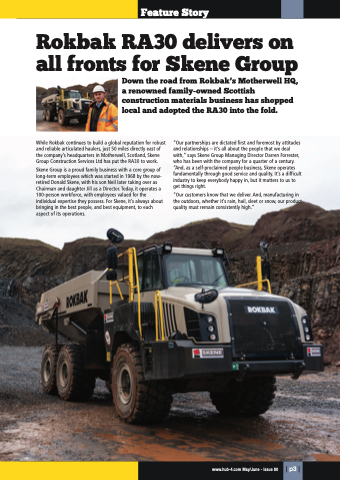 While Rokbak continues to build a global reputation for robust and reliable articulated haulers, just 50 miles directly east of the company’s headquarters in Motherwell, Scotland, Skene Group Construction Services Ltd has put the RA30 to work.