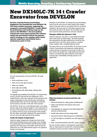 Develon, formerly Doosan Construction Equipment, has launched the new DX140LC-7K 14.6 tonne crawler excavator, replacing the company’s successful DX140LC-7 model. Whilst the performance and working range are the same as the DX140LC-7, the new machine incorporates many improvements that enhance safety and convenience both for the operator and for working on site, together with a better operator experience, particularly from a maintenance point of view.