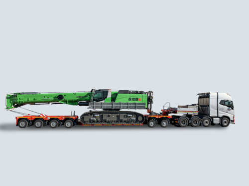 However, for contractors and rental companies alike, transport costs and set-up times are key criteria for efficient crane use. The new SENNEBOGEN 6103 E telescopic crawler crane offers two major advantages here. The machine can be transported completely in one piece. For this, only the ballast must be removed to achieve a transport weight of around 61 t and a width of 3.48 m. The crane weighs less than 40 t and is therefore even easier to transport by low loader, when the crawler tracks are removed beforehand. The highlight is that all assembly steps can be carried out by the machine itself. Auxiliary cranes are not required thanks to the SENNEBOGEN self-assembly system.