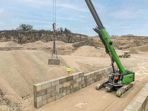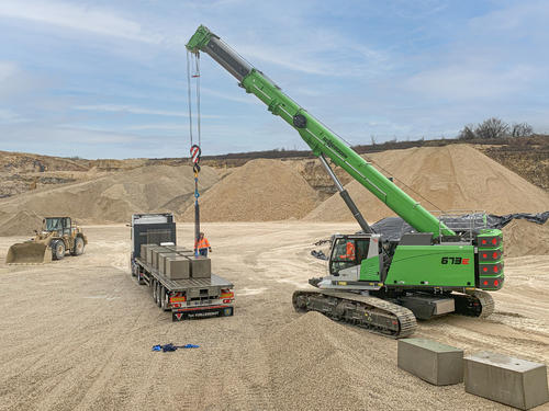 The first assignment is not long in coming. Right in the neighboring region of Bourgogne Franche-Comté, a customer in the mining industry commissions Transconvoi to transport large, Lego-like concrete blocks so that they can then be unloaded directly afterwards and lifted into their final position. For the long-time customer, which mines, processes and sorts raw material from its quarry, temporary walls are to be raised to create separate storage areas for the mined material. These cells will be used to temporarily store the material types according to the process step they are in. With its brand new 70 t telescopic crawler crane SENNEBOGEN 673 E, Transconvoi can now offer a "turnkey" solution for jobs like this, including transport, as well as lifting and positioning of the load.