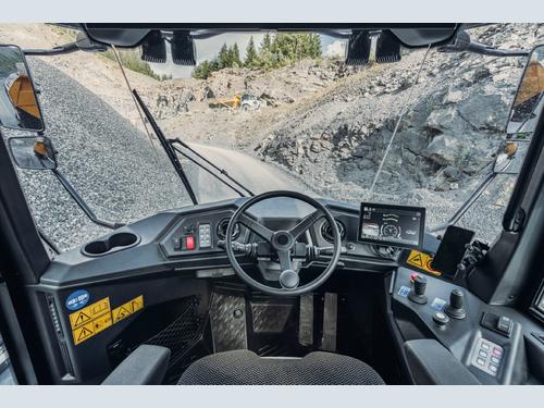 Pulling power is fundamental for articulated dumptrucks and the phrase “it pulls like a train” has been used by several drivers. That’s thanks to the new Stage V Liebherr D956 6-cylinder diesel that delivers 360hp and drives through an automatic powershift transmission with a maximum forward speed of 57km/h, making it one of the fastest trucks of its size on the market. To cope with that speed, the three axles have load-switchable diff locks and four-point hydro-pneumatic suspension to smooth out any bumps in the road.