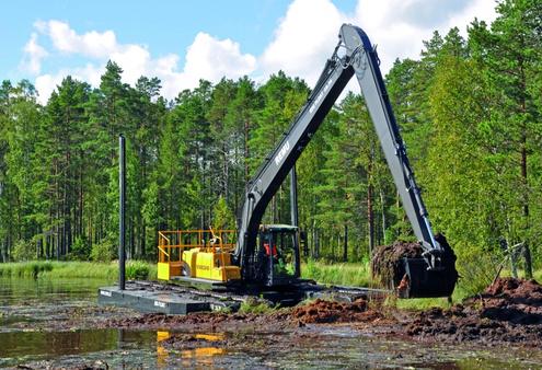 Big Float is a unique amphibious excavator ideal for aquatic environments like shoreline, rivers, swamp, waste ponds and canals. It has a patented pontoon undercarriage that creates a safe working environment in otherwise unsafe locations. It is easy to transport along public roads. REMU Big Float has various applications including: