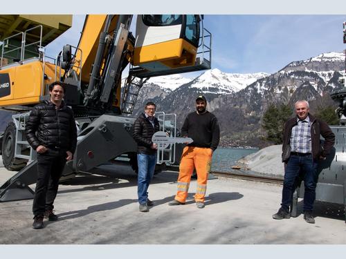 An LH 60 M Port Litronic was recently handed over to Aarekies Brienz AG in Brienz, Switzerland. The Liebherr material handler is specially designed for the economical handling of bulk goods and general cargo. The machine will be in operation extracting and quarrying natural sand and gravel in the harbour of the gravel and concrete plant at Lake Brienz. A special Liebherr clamshell with water slots will be used to extract the harbour’s naturally occuring sand and gravel and feed it into the plant.