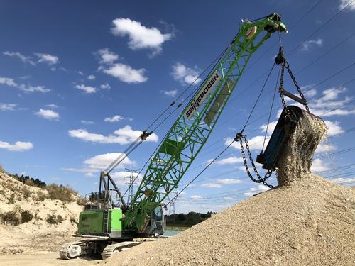 Managing Director Marc-Antoine Adam chose the SENNEBOGEN 640 E duty cyle crane, sponsored by the Grand Est region. Equipped with powerful 160 kN free-fall winches and its 186 kW motor, the machine is ideally designed for dragline shovel operations. Close to power lines, the boom measures 13.1 m in a compact configuration and is therefore perfectly adapted to the conveying depths to be reached. As soon as a larger working area is available at the beginning of 2021, the boom length will be increased to 15.9 m.