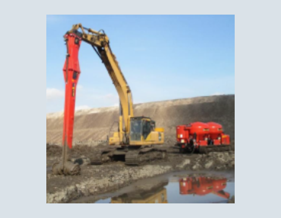 Deep pond stabilization provides an innovative solution that solves problems present in both capping and removal. The ALLU Soil Stabilization System has been used throughout Europe for more than a decade. The system uses a powerful mixing head attached to the boom of a mid sized excavator. The mixing head is fed a dry binder by a computer controlled high pressure feeder creating a homogeneous mix. Unlike bucket mixing; the system is capable of depths beyond 20’. The ash pond is stabilized from the bottom up and not just at the surface. The feeding system regulates with precision the exact amount of binder prescribed by the engineer to fully encapsulate the contaminated site. (BINDER COST CONTROLLED)