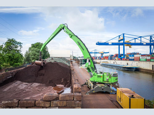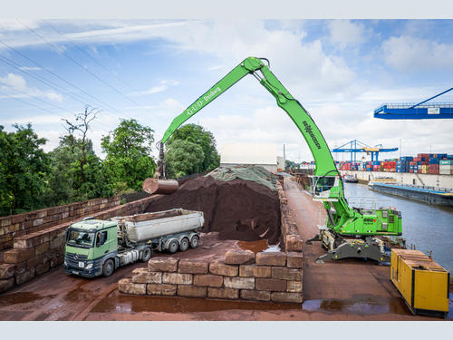 Cargo handling companies like GUD in Duisburg work hard and need specialized machinery to cope with the variety of materials in ports. Every year, approximately 250 ships with a capacity of between 1,000 and 5,000 t dock at this Duisburg quay. In total, around 500,000 tons of material are moved each year, most of which is bulk cargo. In addition to classic bulk handling, GUD also specializes in the rental business: "In order to make the best possible use of our machines, we provide some of our SENNEBOGEN material handlers for use on construction sites or in other ports. Linked to this is our personnel service, because our operators, with their know-how in the rental portfolio, are also more in demand than ever - a clear unique selling point, especially in times of a shortage of skilled labor."