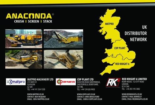 Anaconda Equipment, the Northern Ireland crushing & screening specialist, are delighted to announce 2 new distribution channels in the UK with the appointment of Red Knight 6 (RK 6) and Matpro Machinery Ltd.