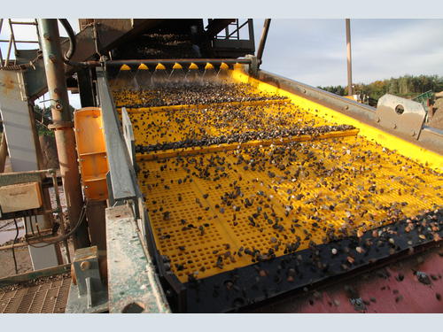 The new CMB screen is fitted with polyurethane deck panels and polyurethane fan sprays and features a lower deck split in half for sand and 6mm, with the upper screen taking the 14-20mm. Material after screening is then fed to three stockpiles of 8/14/20mm.