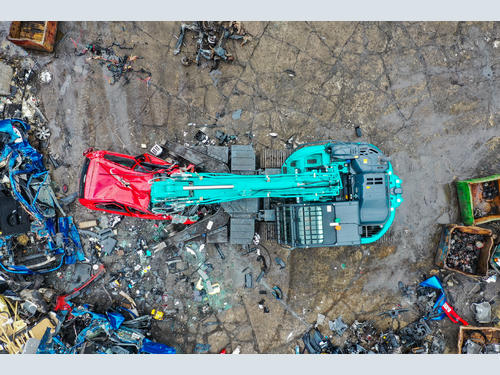 Working on the ‘OHIO – Only Handle It Once’ principle as far as possible, end-of-life vehicles that come through the gate are initially ‘depolluted’ with all oils and fluids drained from them before the Kobelco uses its independently operable gripping arms to reposition the vehicle before metals and materials are stripped and peeled away from the vehicle’s frame. Anything remaining is loaded into the shear and baled.