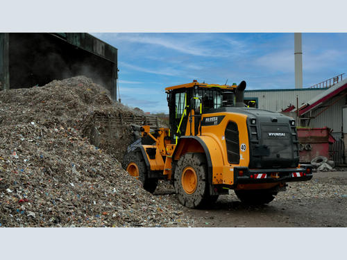 The Hyundai has been supplied in the Korean manufacturer’s HDXT specification designed for the recycling industry. With an operating weight of just over 16 tonnes, the HL955A HDXT comes with a range of additional features designed to increase productivity and to protect the machine and operator working within the waste industry. The most noticeable addition is that of a set of longer loader arms. Offering an increased reach of 600mm over the standard machine’s 3940mm pin height, the HDXT version retain the Z-Bar linkage to retain digging forces for penetrating stubborn materials. Included in this specification is a choice of tyres to suit particular applications with Bloomfield opting for a semi-solid puncture proof version. Additional guarding around the machine covering lights, front and rear cab windows and underbelly increase the durability of the machine. A high-tip bucket and fire suppression kit complete the loader’s specification.
