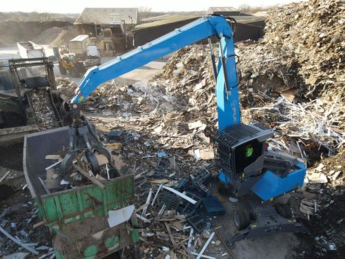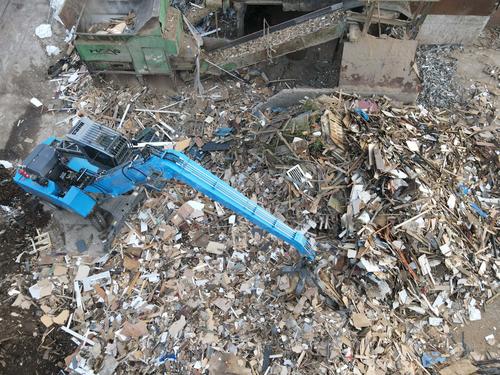 Boden’s brand new MHL 340F, fitted with a 800 litre grab, is being used to feed their static wood processing plant. With its 13.7-meter reach, the handler proves to be a highly efficient method of feeding the plant. The operator drives the material handler into place, parks up and goes to work for 14-18 hours a day, transferring material from stockpiles into a static shredder.