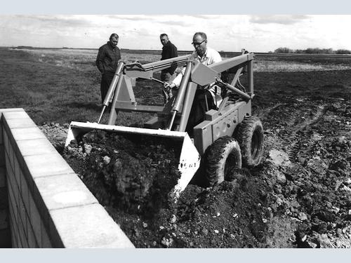 In the 1950s, brothers Cyril and Louis operated a small machinist-blacksmith shop in Minnesota together, building and repairing machinery for local farmers. A farmer approached them with a need for a self-propelled loader light enough to be lifted to the second floor of a turkey barn and small enough to clean around the barn’s upright poles. In response, in 1957, the Kellers built a three-wheeled loader with two drive wheels in front and a caster wheel in the rear – the predecessor to the modern skid-steer loader.