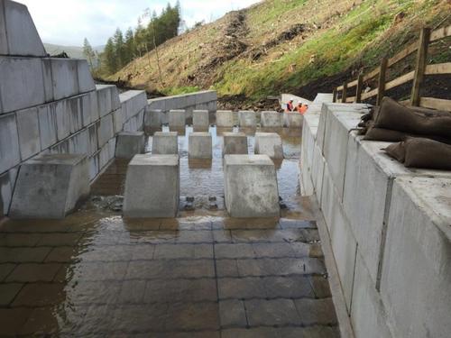 The design work for the project was undertaken jointly by Story Contracting and engineering consultant AECOM. With the worksite being pretty much in the middle of nowhere and sited within a deep ravine, in-situ concrete pours were ruled out. The decision was therefore taken to use pre-cast concrete interlocking blocks to construct the weir and retaining wall. Elite Precast Concrete of Telford is a specialist in this field and produces many ranges of interlocking blocks, troughs, anchor blocks, barriers and posts. Its Legato range seemed ideal.