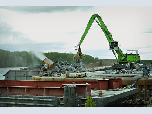 Another area that needed dust suppression was in the industrial park. Located about 700 feet (213 m) inland from the Hudson River with no natural wind barrier, the surface is a combination of concrete, packed earth and gravel. Scrap metal from various sources (demolition projects, old cars, dismantled ships, etc.) is transferred from barges and deposited into storage piles. During windy conditions, the unprocessed metal can emit dust both during offloading from vessels and loading onto ground transport.
