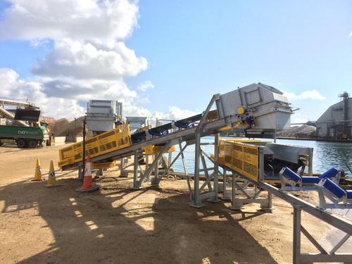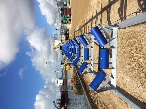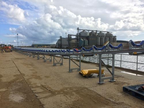 One of the challenges involved tight space restrictions at the site where a conveyor system had to run round the edges of the sea wharf and was also required to leave space round the conveyors for plant access. Added to this, the conveyor system had to finally be capable of discharging the material at right angles to the product flow directly into an existing hopper which was sunk into the ground, which fed onto an existing inclined conveyor to discharge into the sites storage bunkers.