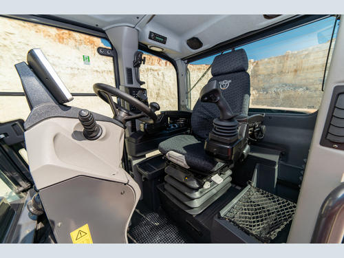 There is a new touchscreen display, for all machine and maintenance info and to provide a monitor for the rear-view camera. This customisable screen is located on top of a redesigned front console. A second console to the right-hand side of the cab incorporates the ignition key, the new electronic hand throttle, a cup holder and USB charging ports. On the left-hand side of the cab there is a spacious storage compartment, which features a rubber strap and net.