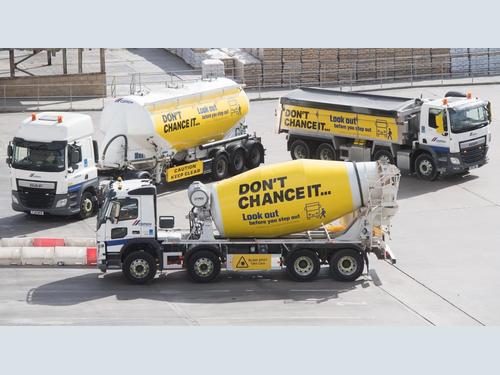 Different types of trucks – tankers, tippers and concrete mixers – are branded with the striking yellow message ‘Don’t Chance it. Look out before you step out’ to alert pedestrians of the potential dangers around large goods vehicles.