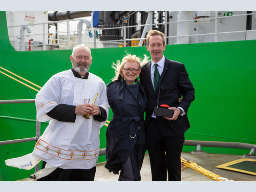 The ceremony on the riverside Ro-Ro terminal at Teesport saw a bottle of champagne successfully smashed on the Emerald Duchess’ striking green hull, following a blessing delivered by the port chaplain Deacon Peter Barrigan.