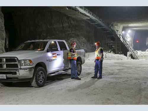 Fifty-ton trucks dump 600-650 t/h (544-589 mt/h) of extracted limestone into an underground hopper that feeds an impact crusher, which reduces the rocks to 4-in. (101 mm) minus. The aggregate is then loaded onto Conveyor 0, a 60-inch (1524 mm) wide belt traveling approximately 700 fpm (3.5 m/s) for 400 feet (122 m). The rock is discharged through a transfer chute onto Conveyor 1, travelling up the 1,300 foot (400 m) inclined belt to the surface and dropping 20 feet (6 m) onto the outdoor storage pile.