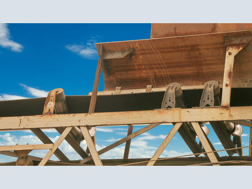 Covers protect the cargo from weather but are used primarily for dust control. Covers enclose the loading zone and contain splashing material caused by significant drop distances from one belt to the other or process equipment such as rotary crushers. The most common cover is the rigid flat cover made from steel. When rain protection or buildup of fugitive materials is a concern, angled or semi-circular covers are often used. [Fig. 5]