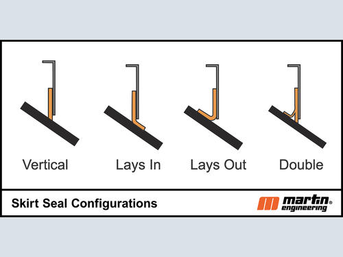 Vertical seal with a rubber or elastomeric material is the most common sealing system. [Fig. 3] The seal is held in place with a series of clamps which can be loosened to adjust the seal against the belt. The main drawback to the vertical seal is that an undulating or vibrating belt can break the sealing contact unless the belt is supported. The lay-in and lay-out seals are self-adjusting depending on the elastic nature of the sealing material. The double skirting configuration is the most effective in retaining a belt seal. Even if the belt profile fluctuates, the secondary seal rides softly on the belt, retaining the seal.