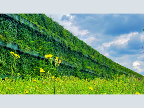 - Construction of one of Europe’s largest green acoustic barriers to minimise the impact of noise and dust on nearby homes. The south facing, 18m high barrier is planted with approximately 3,520m2 of native green foliage. The wall, which has become a haven for birdlife (a flock of bright green ring-necked parakeets are regular visitors to the barrier), insects and other wildlife, is installed with its own irrigation system and provides a natural carbon sink for the site.