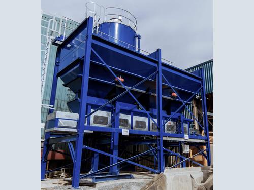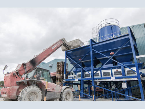 The bespoke plant also comprises of 2x 20T aggregate storage bins with pneumatic discharge doors (discharging onto the weighed belt below) and 300W electrical vibrators. The plant’s integral 600mm weigh belt is capable of delivering up to 200TPH and has a weigh capacity of 0.75m3 per batch. The plant also features a 0.75m3 mixer filling skip.