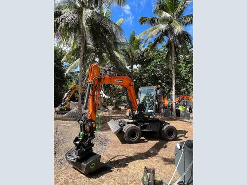 A Develon DX57W-7 wheeled excavator (6 t) with a quick hitch and a Steel Wrist tiltrotator for trying out a wide range of attachments.