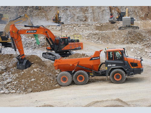 The market-leading DA30-7 and DA45-7 ADTs offer payloads of 28 tonne and 41 tonne, respectively. These models feature an articulation hinge positioned behind the turning ring to provide equal weight distribution to the front axle even during maximum steer articulation. This combined with a free-swinging rear tandem bogie ensures equal distribution of weight to each wheel and guarantees permanent 6-wheel contact and drive for equal power distribution and excellent performance particularly on difficult terrains such as soft ground, uneven surfaces, very steep slopes, tight turns or a combination of all of these difficult conditions.