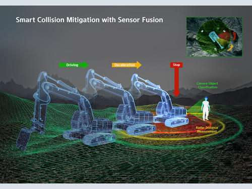 In addition, three wide-angle radar sensors with 180-degree horizontal field of view (FOV) are used to minimize blind spots and accurately measure the distance of detected objects. When a pedestrian or an object is detected within the warning/danger zone, visual/audible warnings are activated, and the swing and driving speed on the excavator are reduced and then automatically stopped to actively prevent accidents.