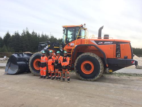 The first wheel loader, a DL550-5, was recently delivered to La Ventrouze in France, the first CEMEX production site to take delivery of machines. Site manager, Romain Legrand, and his team (pictured) welcomed the new DL550-5 wheel loader, which immediately began work at the site.