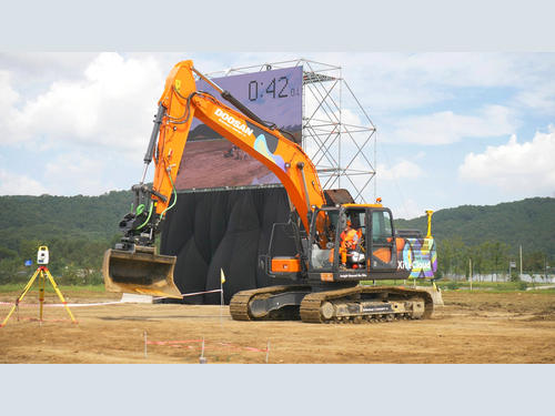 Meanwhile, in the ‘earthwork automation’ competition, Doosan Infracore finished the required excavation work in a highly sophisticated way at unrivalled speed through a machine control* device installed in its excavator - the only participant equipped with such a technology in the contest. Doosan Infracore attracted keen attention by introducing its 3D Tiltrotator**-based integrated machine control technology, which is equipped with high-precision GPS and advanced sensors, for the first time in Korea. Most notably, although the company’s excavator was the smallest among the contestants’ machines, it not only completed the earthwork test faster than the others but was also highly regarded for its accuracy compared to the other competitors when operating on complex slopes.