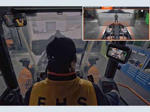 The Transparent Bucket is the first safety system of its type for wheel loaders. Due to the blind spots caused by buckets, the area in front of wheel loaders is considered a potential risk area. The new Transparent Bucket device records images at the front of the loader using cameras placed at the top and bottom of the machine. Using a curved projection method, the system displays combined images in real time on a monitor installed in the cab.
