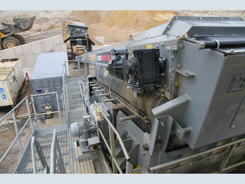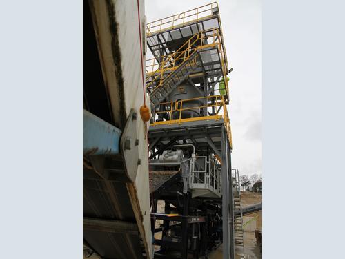 A specially designed rubber-lined underflow box allows a single concrete sand fed via separate conveyors to stockpile. All screen media (polyurethane modules) was supplied by Tema Isenmann.