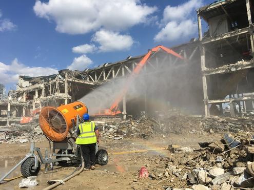 The new DustBoss’s first outing immediately put it to the test on the Isle of Dogs, close to the financial sector of London’s Docklands. This large-scale demolition project is in the very capable hands of The Erith Group who are keen to ensure they have the best and widest coverage of dust suppression available to ensure minimal impact to nearby residents and the environment. The DustBoss DB60 has the best performance of any dust suppression unit they’ve tried to date with a massive 65m throw and 1900SqM coverage.