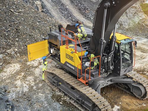 The EC530E and EC550E have been designed with high durability and maximum reliability at their core – even when working in tough applications. Clever measures include the removal of hydraulic pilot lines, reducing the number of couplings needed. The electrical system is also now more robust, thanks to connectors that exceed the tough water ingress protection standards. Time and maintenance costs are further reduced, due to the engine oil and filter change intervals extended to 1,000 hours and ground-level access to grouped filters. A three-point right hand side access to the upper structure provides easy access to the UREA/DEF tank, which also features a splash guard to avoid spillages (and corrosion risk).