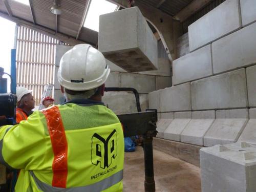 The off-loading and installing of the blocks was contracted to the specialist lifting and contracting business owned and operated by Andy Fones – AA Installations. Andy has many years of experience of operating at the highest level of safety standard whilst completing some of the most challenging lifting / placing / installing projects involving heavy precast concrete elements.