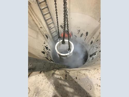 The inner eccentric bushing was removed from the eccentric tube with the aid of the overhead crane, the eccentric bore was measured and inspected for signs of wear and defects. The new inner eccentric bushing was placed in the cryogenics tank and cooled with liquid nitrogen. Once the inner eccentric bush had reduced in temperature, it was carefully lifted out and lowered into the eccentric tube and then allowed to return to ambient temperature before being secured with the fixing bolts.