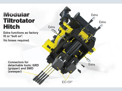 Engcon has upgraded its unique modular design for its automatic EC-Oil hydraulic connection system enabling the quick connection of a GRD detachable grab cassette and SWD detachable sweeper without using hoses inside the hitch.