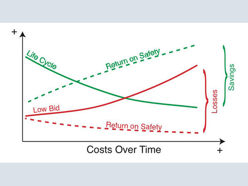 But when companies buy on price, the benefits are often short-lived, and costs increase over time, eventually resulting in losses. In contrast, when purchases are made based on lowest long-term cost (life-cycle cost), benefits usually continue to accrue and costs are lower, resulting in a net savings over time.”[4]