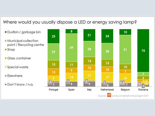 The results of this survey confirms the EucoLight position, that all types of lamps should be collected together in the same container. This would avoid the risk of consumer confusion between lamps leading to a decrease in recycling efficiency and a possible decline in the recycling rate. It also confirms that it is appropriate for LED and other lamps to be recorded within the same category or subcategory under the WEEE directive.