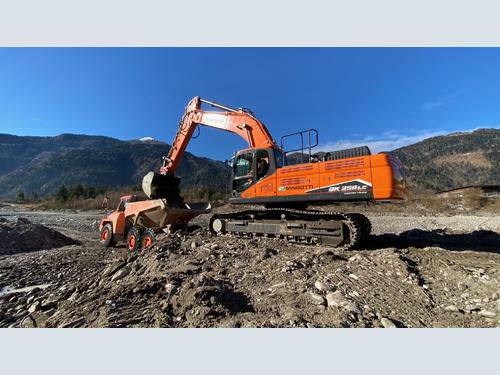 Part of a fleet of Doosan equipment, including two further crawler excavators, two articulated dump trucks (ADTs) and a wheel loader, the DX350LC-7 is involved in cleaning and safety operations along 4 km of the riverbed, to repair damage caused by the catastrophic Vaia Storm at the end of 2018.