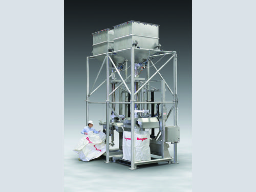 Bagging rates are further increased by drastically reducing the time needed to load material into the bag. Whereas conventional fillers are typically mounted on load cells, allowing a PLC to open and close a valve or start and stop a conveyor to slowly fill the bag by weight, the new system employs dual gain-in-weight hoppers positioned above the bulk bag fillers. This allows pre-weighed material to descend into the bag at extremely high rates, and saves additional time by refilling the weigh hopper while the full bag is being removed and an empty bag is being connected.