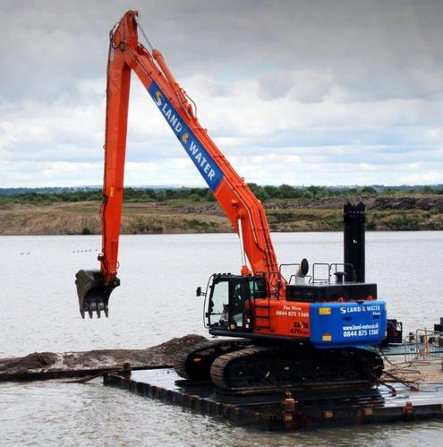 The specialist team at Land & Water are retrieving the remaining material by floating a 20 metre, ZX470 long reach excavator on one of their own pontoons. The pontoons are designed to carry the long reach safely yet can still be transported by road, a must for this scheme because of its landlocked location.