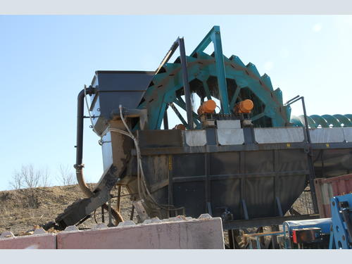 It a quite simple but effective machine with a screw moving all the sludge slowly to the bucket wheel which processes 12-13t/hr of silt.