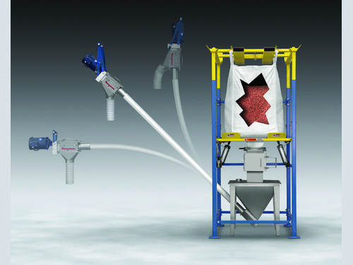 The bag outlet spout is pulled through an iris valve which is then closed, preventing material flow while the spout is untied and the access door is closed. Releasing the valve slowly prevents uncontrolled bursts of garnet into the hopper and dust into the plant environment.